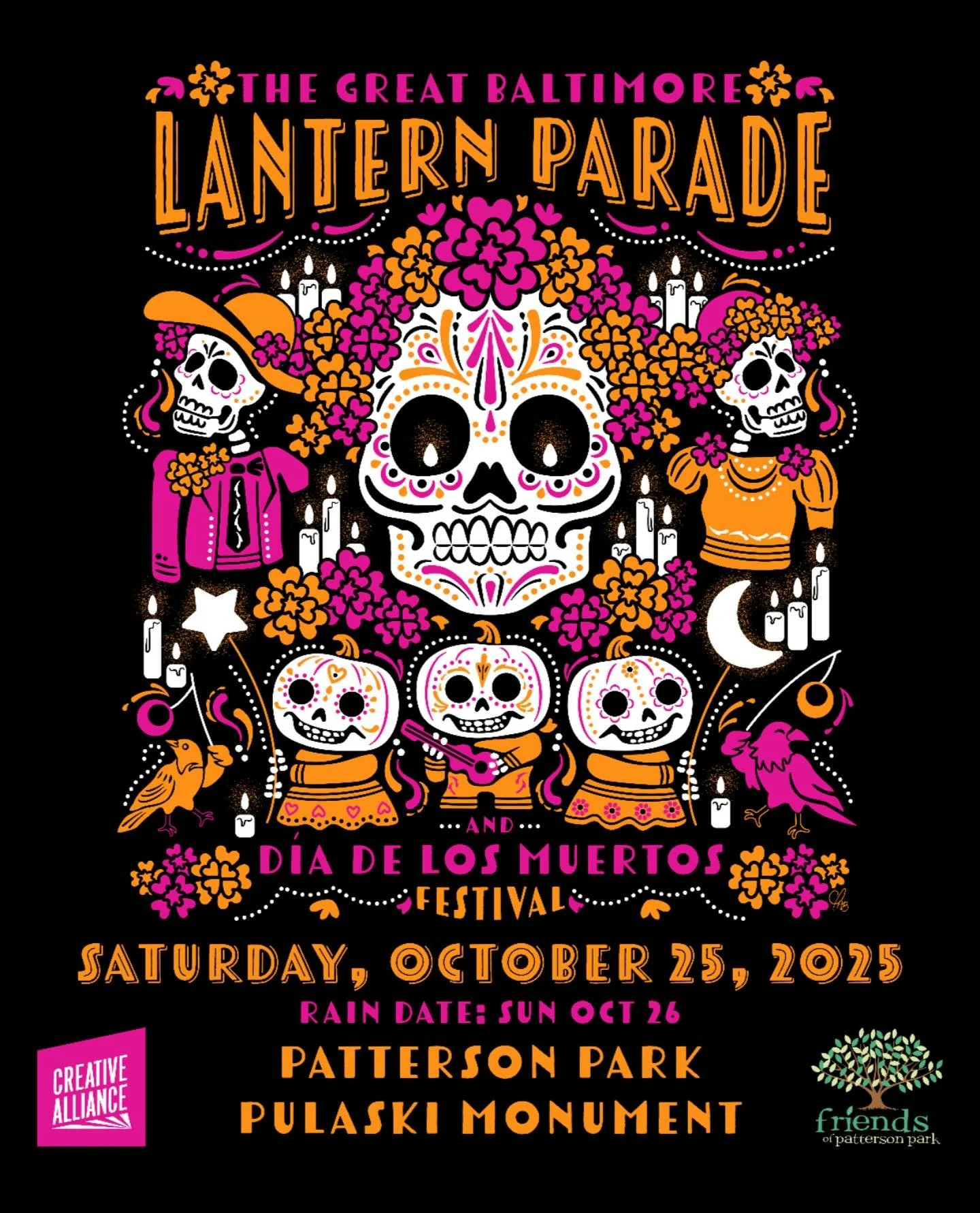 Join neighbors, friends, and family at Patterson Park on Saturday, October 25 for The 26th Annual Great Halloween Lantern Parade and Dia De Los Muertos Festival. The day begins with a family festival, featuring an adorable kids' costume contest, lantern making, pop-up performances, an arts & crafts market, and more. Once the sun sets, the magic begins. Everyone is welcome to grab a lantern and march with thousands of neighbors, artists, musicians, and performers or line the parade route to watch the delightful Great Halloween Lantern Parade wind through the night!! Festival 4:00 pm, Parade Line-up 6:30 pm, Parade 7:00 pm. Costume Contest: Registration for kids and families begins at 3:30 pm, Contest begins at 4:30 pm.