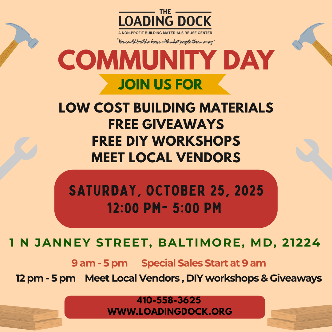 New homeowner? DIYer? Contractor? Artist? Come to the Loading Dock Building Reuse Store’s Community Day on October 25, 9:00 am – 5:00 pm at 2 N. Kresson St.! Explore hands-on workshops, giveaways, and special sales on reclaimed building materials—all while supporting this non-profit neighbor.