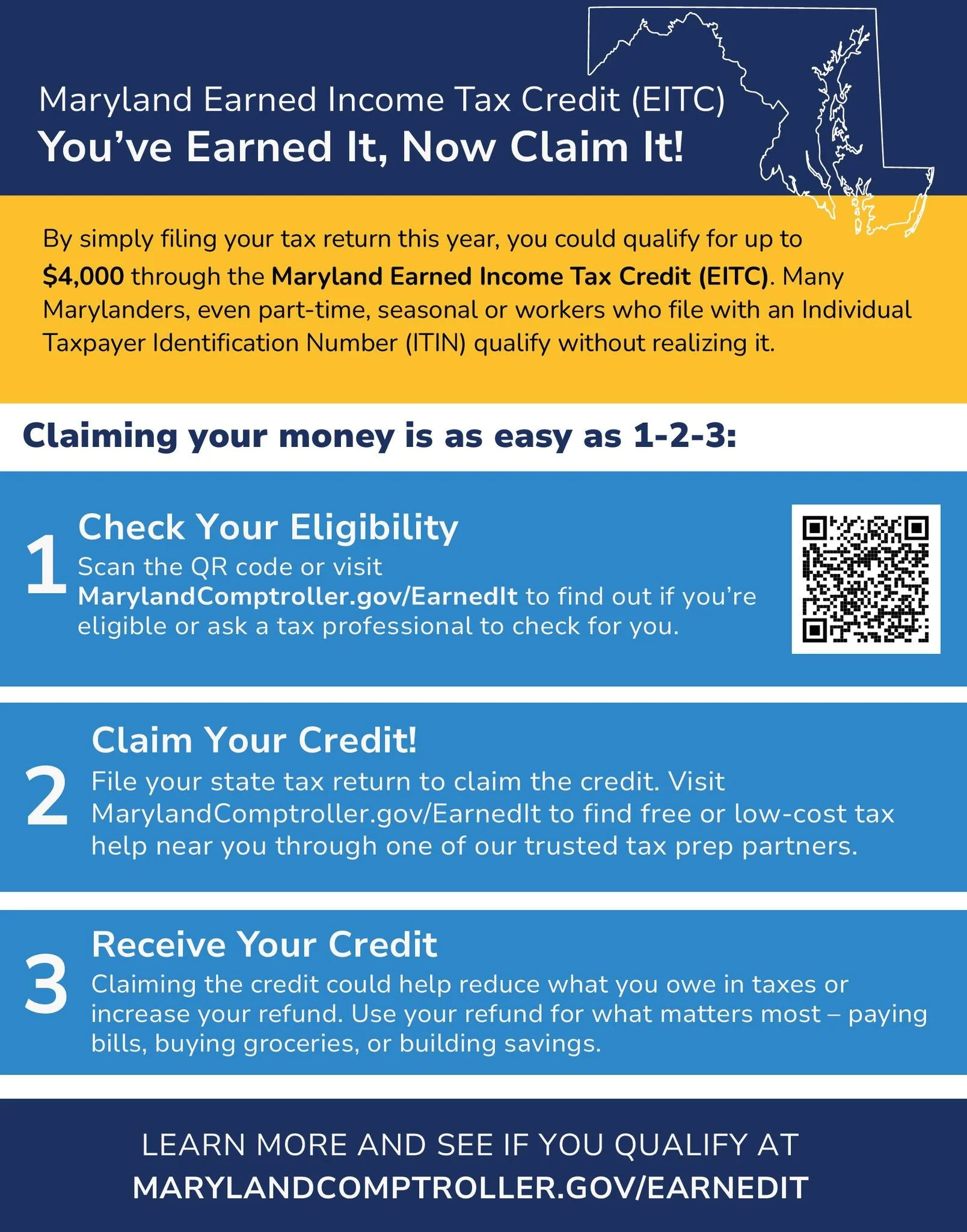 Earned Income Tax Credit (EITC) is one of the most impactful tools available to help working families keep more money in their pockets. The Maryland EITC can provide significant financial relief for eligible residents, yet many individuals who qualify do not always claim it. Visit MarylandComptroller.gov/EarnedIt to find out if you’re eligible or ask a tax professional to check for you.